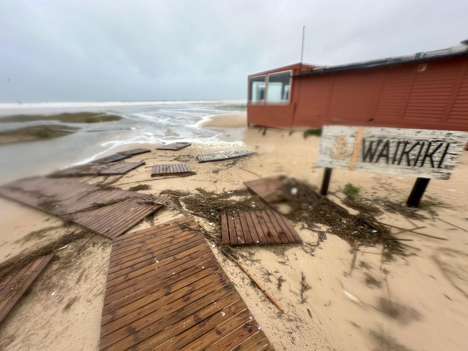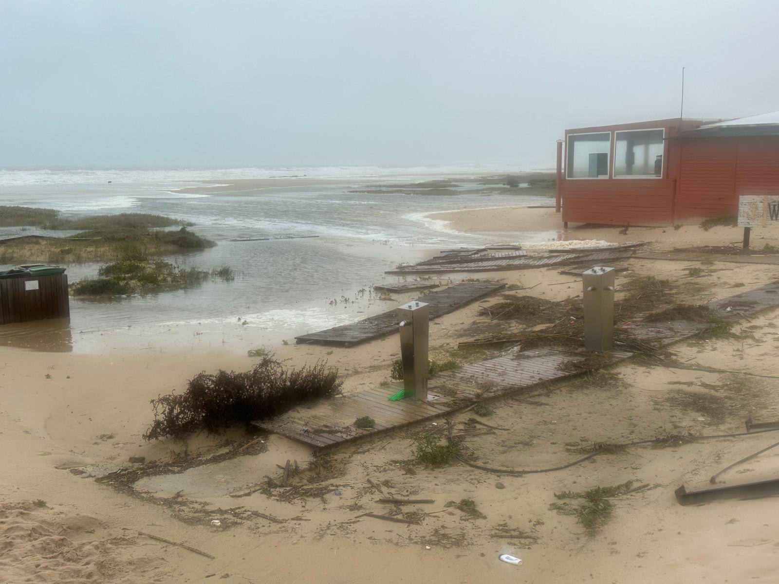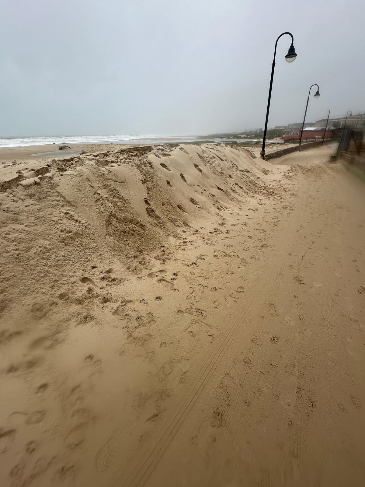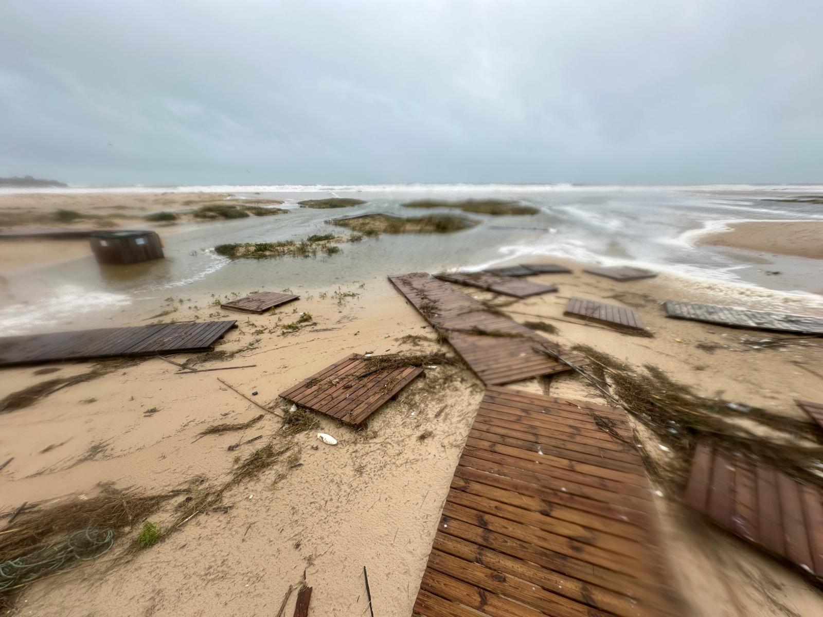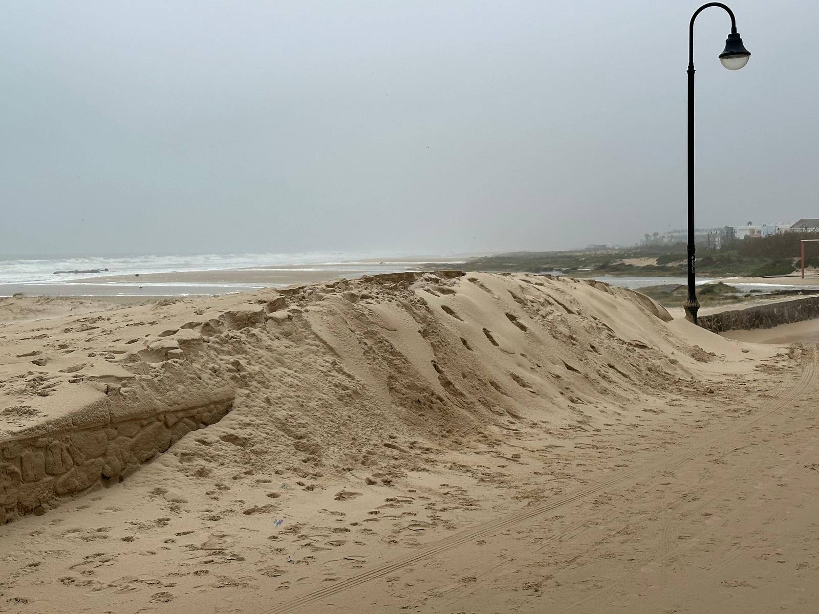 Las imágenes captadas tras el paso del temporal muestran pasarelas arrancadas y esparcidas como hojas, dunas desplazadas sobre caminos, arenas que conquistaron el asfalto y el mar desbordándose hacia la tierra, borrando durante unas horas la frontera entre ambos mundos. En la costa, el oleaje rompía sin tregua mientras la lluvia y el viento dibujaban un paisaje cambiante, verde y ocre, húmedo y desnudo.