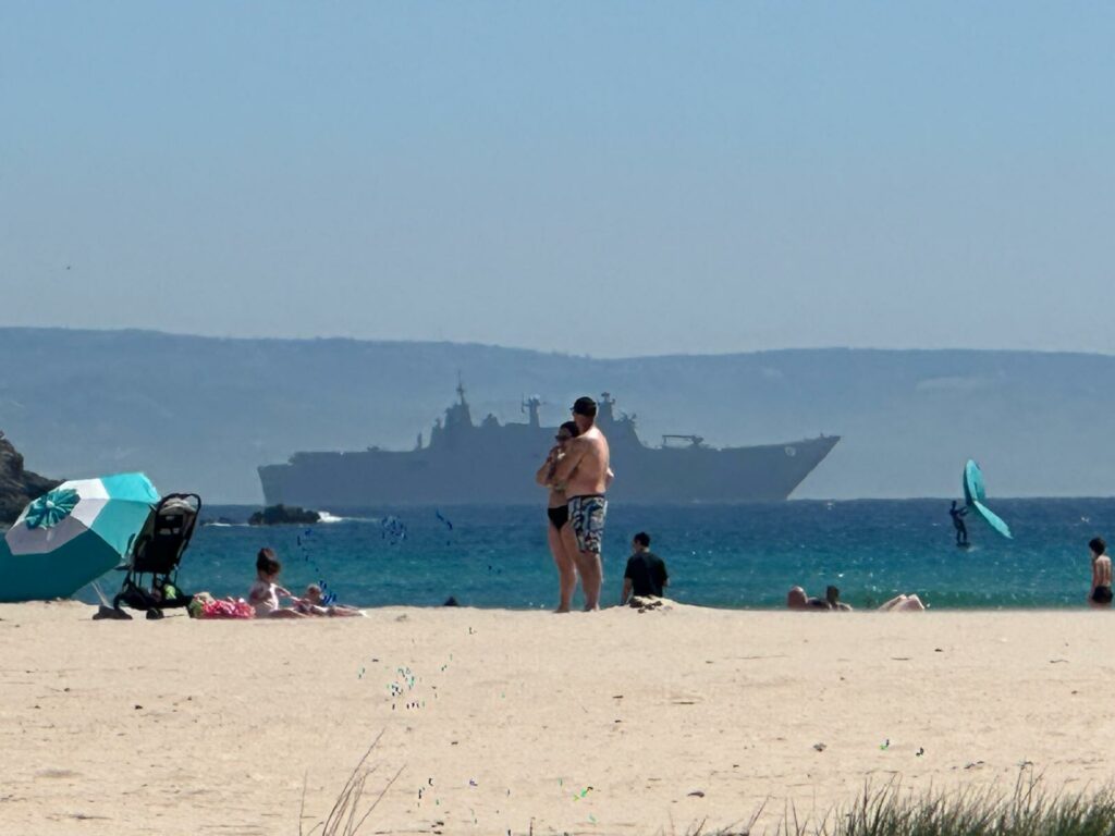 El levante dio tregua ayer domingo y la playa se llenó de bañistas, ya saben, en la playa el deporte nacional es la observación y ayer en Los Lances hasta cinco impresionantes barcos de guerra se avistaban a simple vista con su colosal dimensión. Es la foto del día, el contrates entre las máquinas de guerra más caras y grandes hechas por el hombre y una tarde en la playa de Tarifa. Contraste de sueño y realidad.