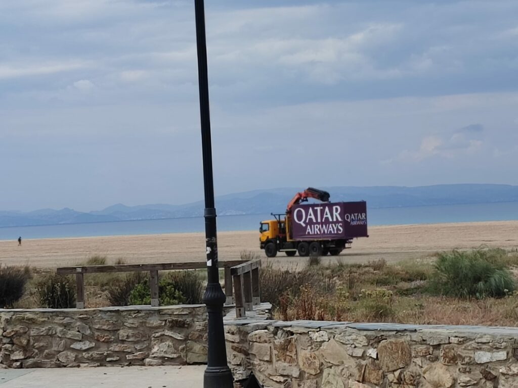 Un camión circulando por la playa de Los Lances con un módulo que es publicidad de una dictadura árabe es como mínimo impactante.