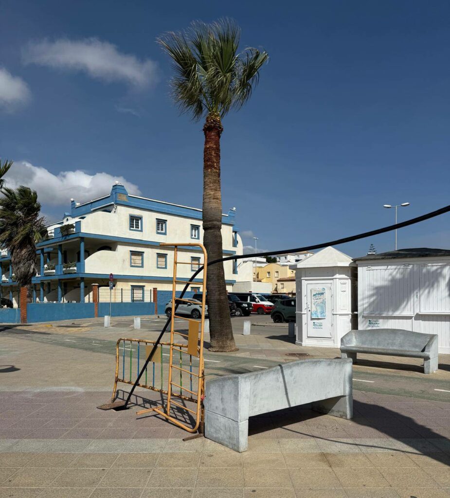 ES LA FOTO DEL DÍA. La imagen habla por sí sola: una palmera rodeada por vallas improvisadas y estructuras metálicas en pleno Paseo de Los Lances, una de las zonas más transitadas de Tarifa, luce estos días un aspecto poco cuidado justo en el Puente del Pilar, uno de los fines de semana con mayor afluencia turística del año.