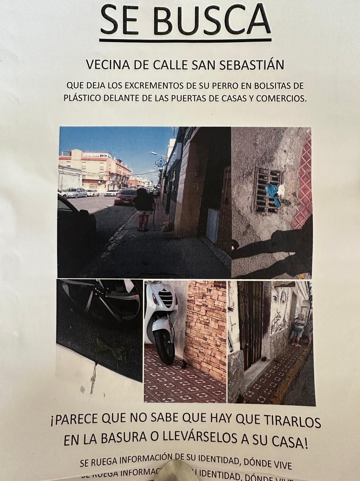 En diferentes puntos de la calle han colocado un llamativo cartel en el que se busca a la persona responsable de esta conducta “insolidaria”. El mensaje es directo y apela al civismo: no basta con recoger los excrementos, hay que tirarlos a la basura o llevárselos a casa. Las imágenes impresas, tomadas por los propios vecinos, muestran varios de estos depósitos improvisados en la vía pública y el recorrido de la autora —según creen— durante sus paseos diarios.