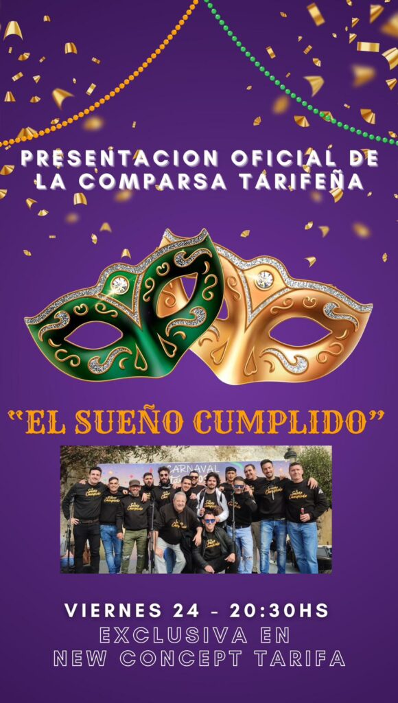 En Tarifa, se prevé que este próximo viernes 24 de febrero La Comparsa Tarifeña («El sueño cumplido») haga de forma oficial su presentación. Se trata de un evento que tendrá lugar a partir de las 20:30 horas en ‘New Concept Tarifa’. Para todos aquellos que deseen asistir deben saber que habrá una barra con cerveza y comida para los asistentes, tal y como asegura la organización del evento.