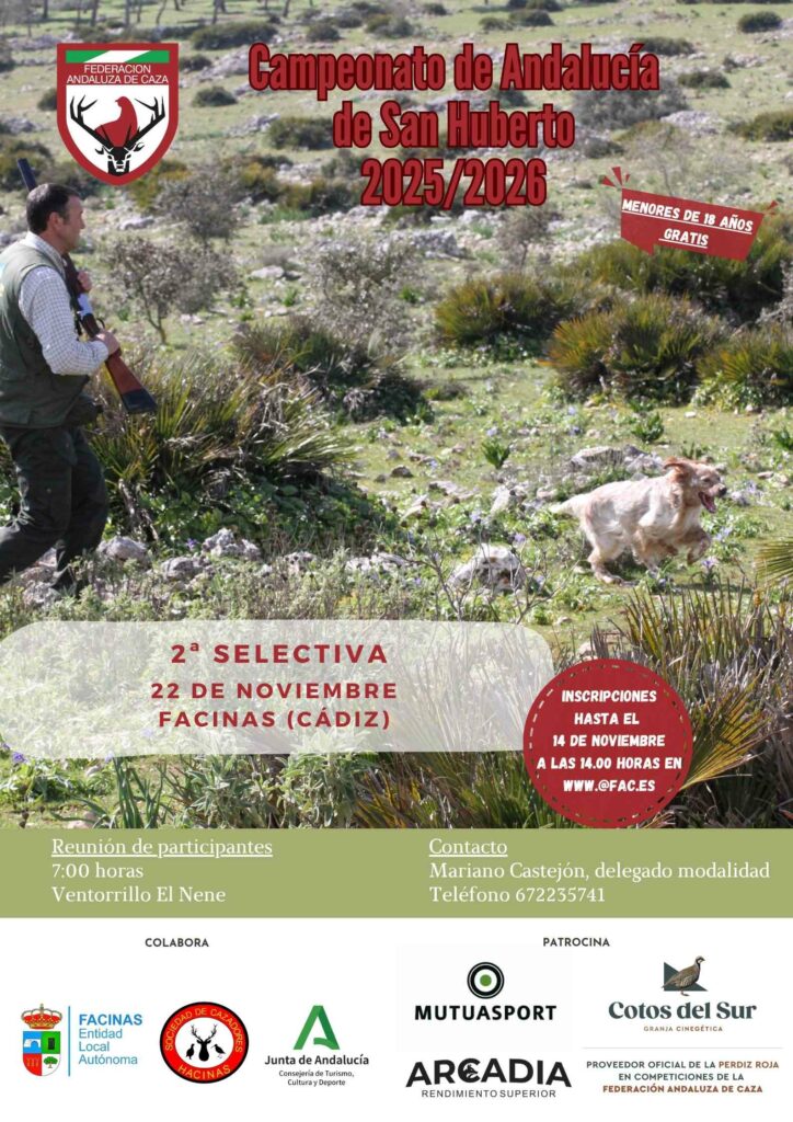 La segunda selectiva del campeonato andaluz de la disciplina de San Huberto para perros de muestra se celebrará el próximo 22 de noviembre de 2025 en Facinas (Cádiz), según ha anunciado la Federación Andaluza de Caza.