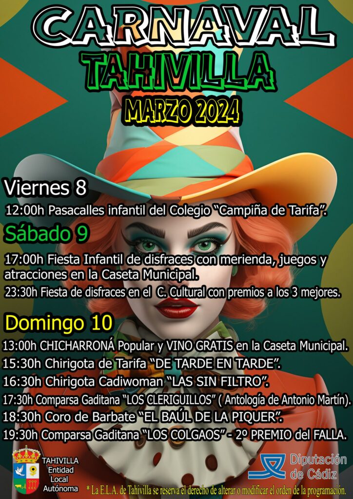 La agenda para este fin de semana carnavalesco de Tahivilla viene repleta de buen carnaval, fiestas de disfraces y de agrupaciones que visitarán la ELA para dejar actuaciones espectaculares como no puede ser de otra manera. El sábado 9, tendrá lugar la fiesta Infantil con merienda, juegos y atracciones en la Caseta Municipal a partir de las 17:00h. Posteriormente, a las 23:00h, comenzará la Fiesta de Disfraces en el Centro Cultural con premios para los tres mejores.