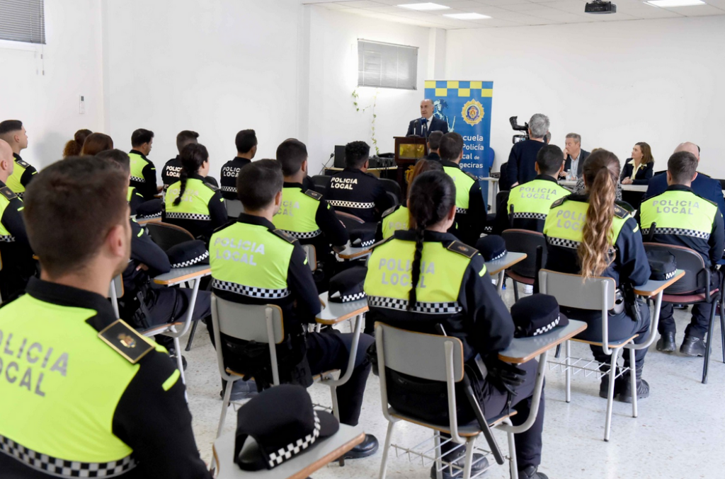 El alcalde, José Ignacio Landaluce, ha presidido esta mañana el acto de clausura de la formación teórica de la mayor promoción en la historia de la Policía Local de Algeciras, a la que se han sumado aspirantes de los municipios de Rota, Barbate, Los Molares y Benalup-Casas Viejas.